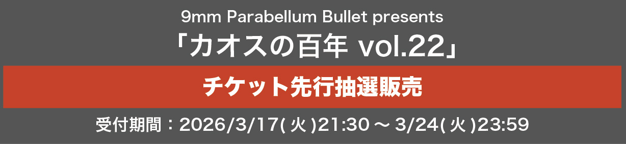 どこよりも早い9mm MOBILE会員チケット先行抽選!9mm Parabellum Bullet presents 「カオスの百年 vol.22」のチケットを販売致します。